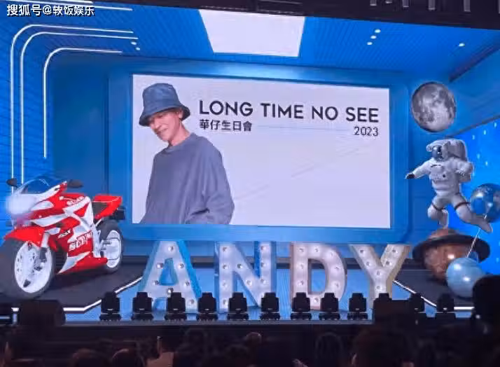 以藍色為基調的舞台上,擺放著一輛機車,和一套登陸月球的航空服。 不知這樣的設計是不是為了致敬今年年初上映的《流浪地球2》。 舞台正中央則擺放著由藍、橙、綠三色彩光燈組成的劉德華英文名「ANDY」。