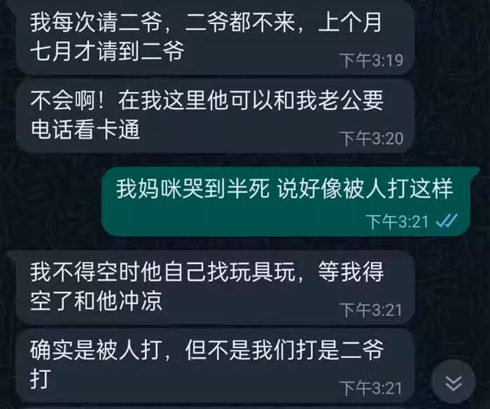 內容稱,男童母親稱,外婆看見男童傷勢時,心痛得不斷流淚,指傷勢似乎是被人毆打所致,而保母較後稱:「確實是被人打,但不是我們打,是『二爺』打!」