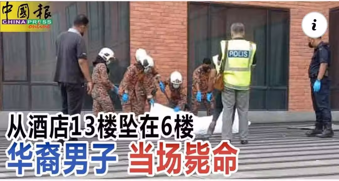(怡保1日訊) 華裔男子不知何故從酒店13樓墜下,並墜在6樓處,當場喪命。