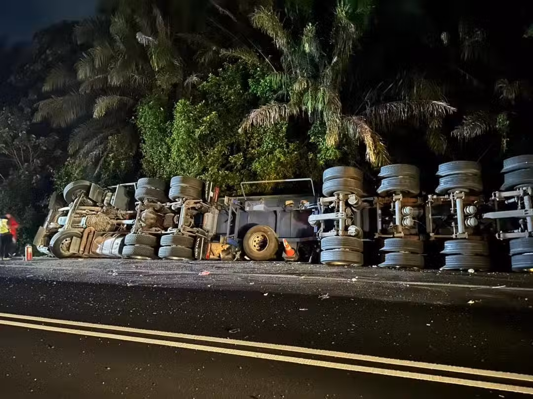 運載棕油的羅厘在行駛途中失控沖入反方向車道,撞上兩輛轎車後翻復。