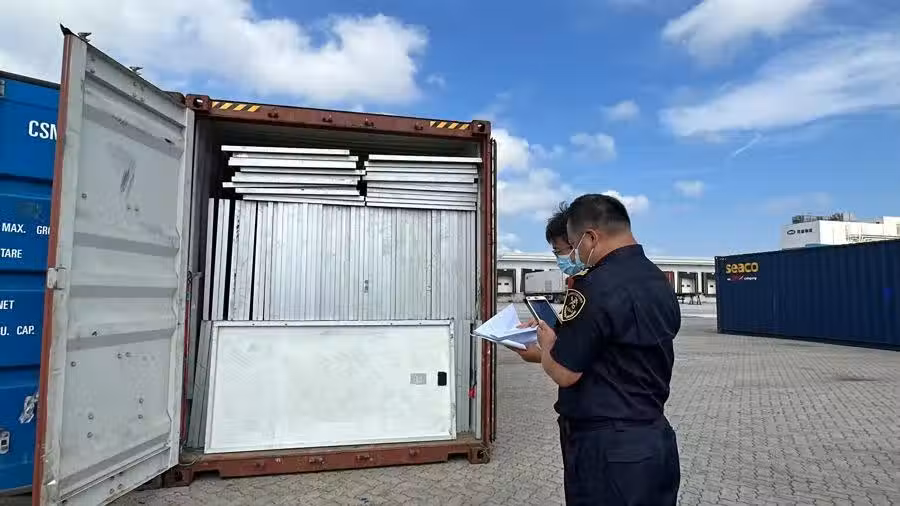 洋山海關在進口太陽能組件中查獲固廢。(談鑫晨 攝)