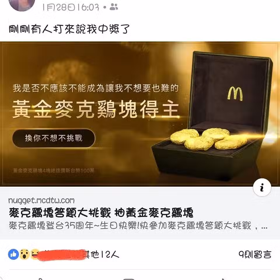 這位幸運得主在臉書社團「爆廢公社二館」PO文,「真是太太太幸運了,起初我不以為意,我以為是詐騙集團,結果沒想到是真的!」大方秀出本尊。照片中黑色盒子上頭印著「麥克金雞塊」的中英文,包裝看起來低調又奢華。