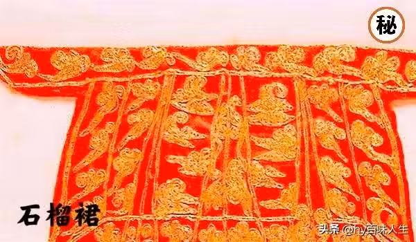 「石榴裙」就是石榴紅顏色的裙子,裙子上繡滿了金絲,所用的金絲平均直徑為0.1毫米,而最細處僅有0.06毫米,比人的頭髮絲還要細。