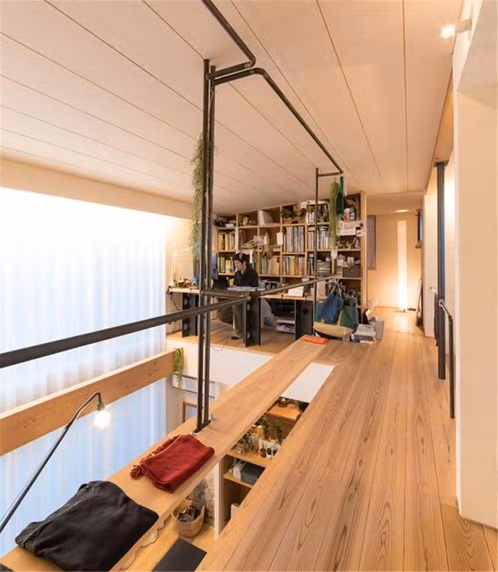 走上二樓後,驚奇地發現二樓其實也算是開放式設計, 除了書架後的臥室,以及餐桌正上方打通的空間外,可活動的區域內基本沒有隔斷,而是通過吊裝木板打造出了一整排懸空書桌,為夫妻倆提供辦公區。