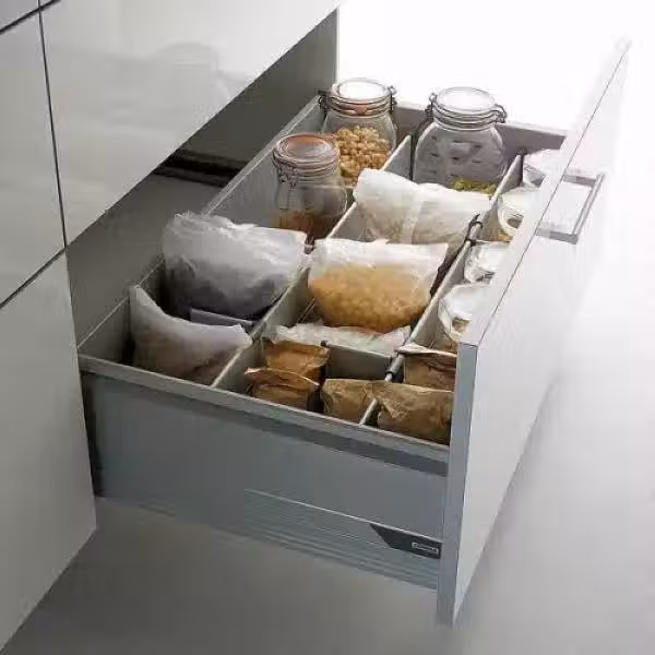 抽屜最大的好處就是,拉出來內部空間一目了然,利用隔斷、拉籃等,可以通過提前規劃,給廚房用具找到一個固定合適的地方,這樣拉出來,迅速找到自己需要的東西,推進去油煙進不去,不怕臟。