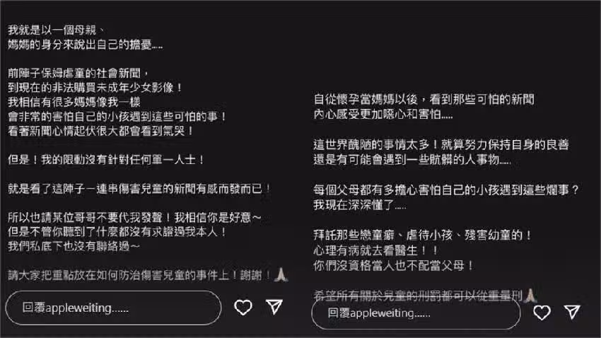 不過Apple稍早再度於IG發文表示,自己是以母親、媽媽的身分說出擔憂,從前陣子的保母虐童案,再到現在的非法購買未成年少影像,讓她感到害怕,看到新聞還會被氣哭。
