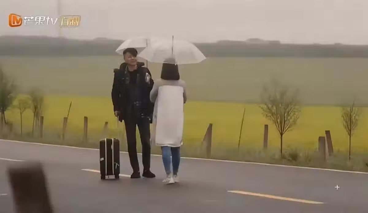 陳美玲撐著透明雨傘,拎著行李箱,先到達現場,艾威隨後也撐傘緩緩走過來。