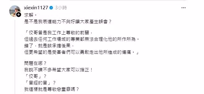面對網友批評,謝忻十分不解,便再度發文寫下「是不是我表達能力不夠好讓大家產生誤會?」,好奇「問題在哪?