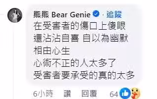 熊熊譴責惡意網友:「在受害者的傷口上撒鹽,還沾沾自喜、自以為幽默,相由心生,心術不正的人太多了,受害者要承受的真的太多。」有網友安慰、勸她別管其他人想法,熊熊則回應:「是啊,但看到還是會驚訝人性的可怕。」言語流露無奈之情。