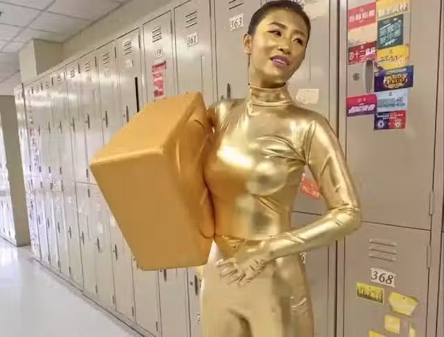 TVB新人女星扮人肉獎盃,滿臉塗成金色,連體服太薄未穿打底內衣