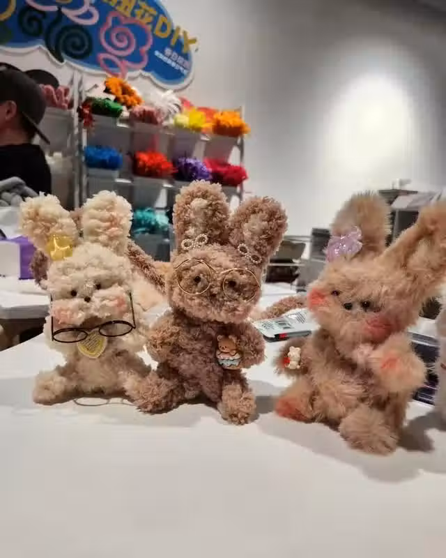 從陳茵媺分享的視頻看到他們一家在一個編織扭扭條的工作坊專心做心愛的公仔,陳茵媺母女用上深咖和米白色的扭扭條出兔兔公仔。