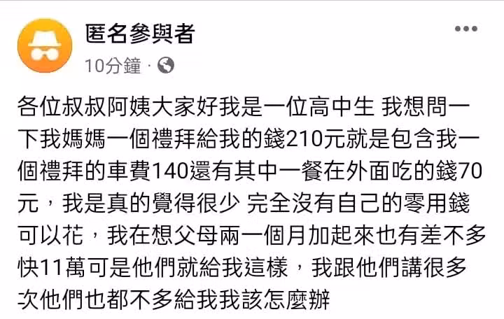 各位叔叔阿姨,我是一名高中生,爸媽每月收入快11萬,卻只給我每周210元零用,包括140元車資和外食一餐70元,我是真的覺得太少,講很多次他們都不多給... #確定是親生