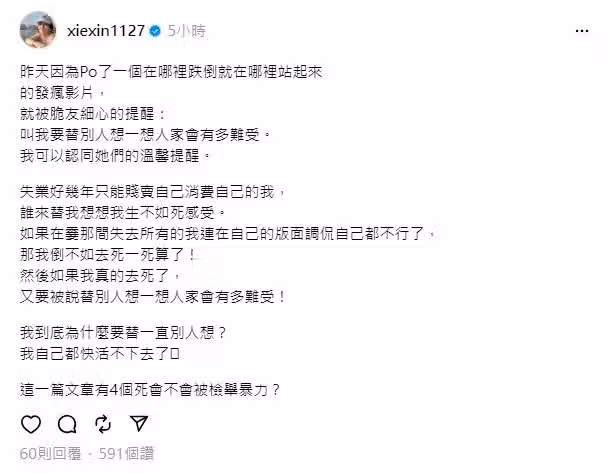 被提醒要顧慮別人感受的謝忻,在文章中表示認同網友的說法,但她除了認為自己已經為錯誤付出慘痛的代價以外,也表示自己需要有地方可以宣洩,「我連工作都沒了,失業了好幾年。
