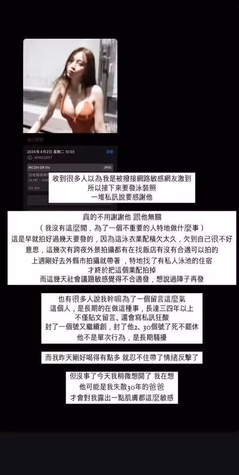 為了對方身心健康著想,已先行封鎖賬號,勸對方別再開新賬號來看她IG,否則「怕您是要氣瘋了」。