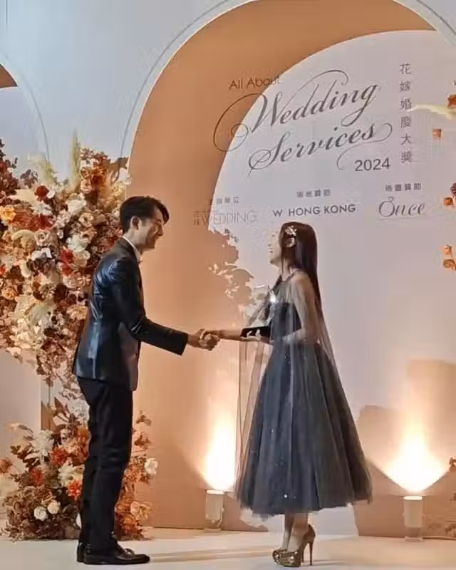 從黃美棋分享的兩張照片看到,兩人以情侶裝打扮,黃美棋一襲黑色晚裝,鍾健威穿上黑色皮西裝,黃美棋頒發「星級人氣婚禮司儀「大獎給鍾健威時,比老公笑得開心,兩人相對大笑,握過手後才頒獎,之後更在台上雙雙比心,閃到爆!