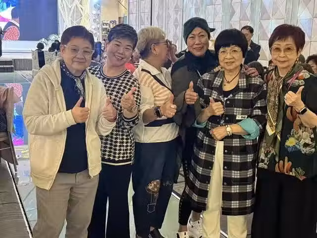 早前佘詩曼媽媽(右三)現身另一聚會,亦以布包頭。