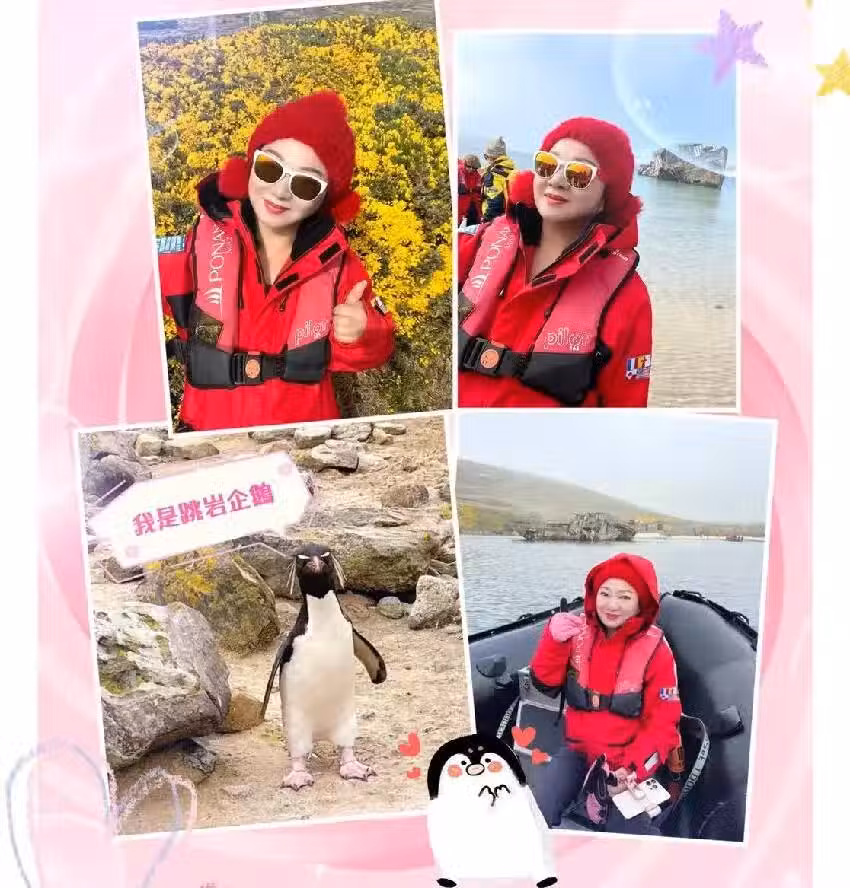 從畫面中可以看到,「摸黑起早三點叫早起,四點出發直奔機場,飛往烏蘇懷亞,阿根廷的最南端,再過去就沒路了都是海洋,飛行時間3個半小時,氣溫下降了,晚間會到達零下5度,簡單的市區觀光之後,午餐吃了烏蘇懷亞獨特的烤羊肉,終於到達我們的目標地,要開往南極的小郵輪」。
