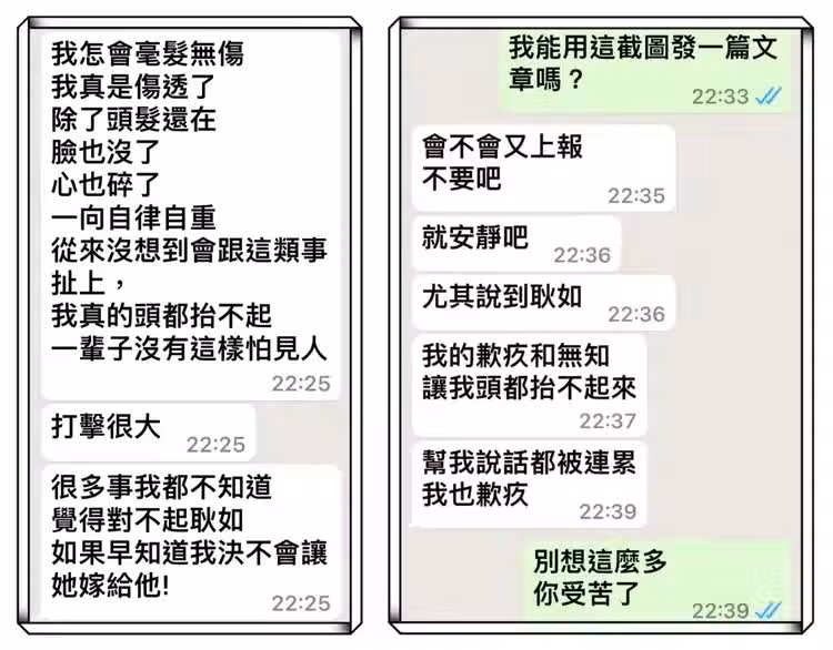 她對高愛倫說:「除了頭髮還在,臉也沒了,心也碎了,一向自律自重,從來沒想到會跟這類事扯上,我真的頭都抬不起,一輩子都沒有這樣怕見人……」