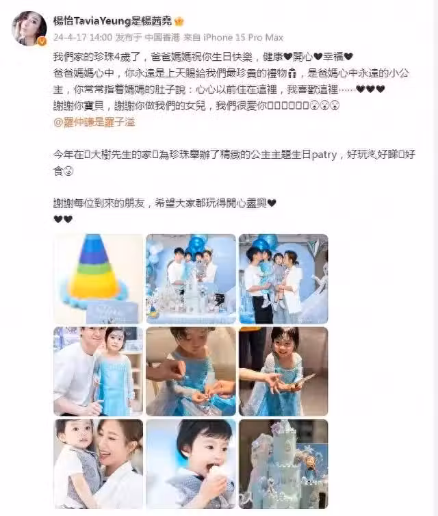 4月17日下午,演員楊怡在個人社交平台分享了一組為大女兒小珍珠慶祝4歲生日的照片,她還發布長文寫下了對女兒的愛意,看得人觸動滿滿。