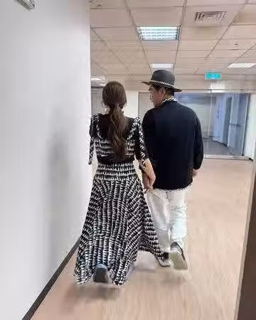 吳宗憲跟吳姍儒主持至今已經8年。照片中的他女兒錄完影手牽手,準備走進去休息室。吳姍儒一身黑白紋的長洋裝,吳宗憲則頭戴深色紳士帽,穿著黑色上衣搭配白長褲,父女倆互動溫馨。