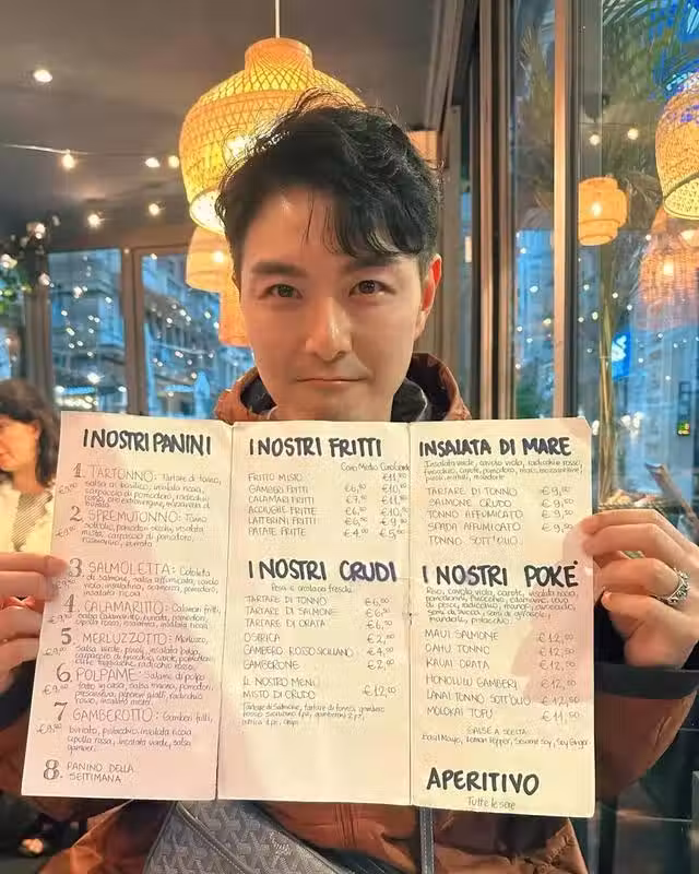 而不懂義大利文的蕭正楠亦分享了一個鬼馬帖子,他寫道:「感謝科技讓我在哪裡都能輕鬆點菜,好吧...。今晚吃... 去tm的坎博里、鮪魚榨汁機,看... 懂義大利文的男人是吸引的,Ciao。」