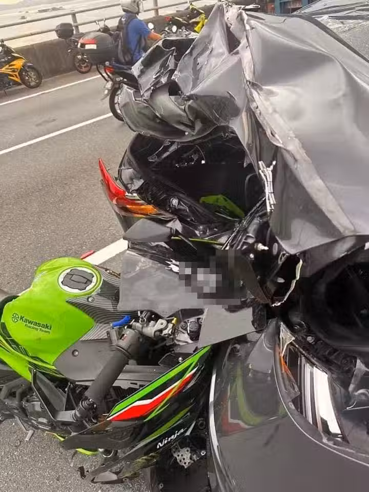 (新山20日訊)馬新第二通道往新山方向今早出現堵塞,兩名相信是越堤族的青年,各騎乘的摩哆陸續撞上堵在車龍的同一輛轎車,其中騎重型摩哆的騎士被飛拋到路面重摔喪命。