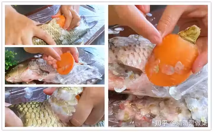 三、 胡蘿蔔在魚的背部上,來回的刮除,這裡需要提醒大家的是,我們在刮魚鱗的時候, 記得一定要把魚背的上面和下面來回的刮除乾淨為止即可。