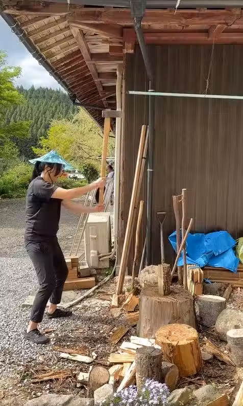 這次蒙嘉慧貼了一段短片,視頻中看到她戴著太陽帽,一身黑衫黑褲示人,打扮非常樸素。蒙嘉慧還扎穩馬步,聽著旁人指示,用雙手舉起大斧頭,手起刀落,將木頭輕鬆劈開兩半,姿勢相當豪邁!