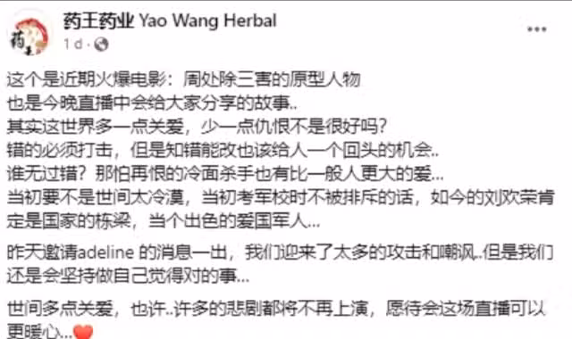 中藥店此前在臉書發文指出,每個人都有過錯,「但是知錯能改也該給人一個回頭的機會,這世界多一點關愛,少一點仇恨不是很好嗎?」