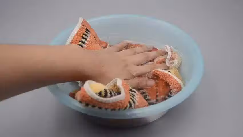 第二步,準備一條毛巾,將毛巾塞進水盆里蘸濕並且擰成半乾的狀態。