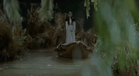 十里湖邊恢復女裝的黃蓉,身著一襲白色長衫,肩披黑色毛絨小披肩,頭束金色髮帶,腰系金色寬腰帶,一葉扁舟,立於船頭,莞爾一笑間躍然臉上的那股清甜氣息純真靈動。