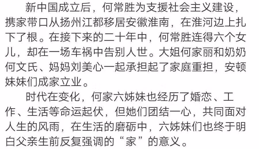 備受關注的年代家庭情感劇《六姊妹》近日已經在安徽開機,該劇根據伊北同名小說改編,由樓健執導,主演從楊紫開始到趙露思再到王一博溜了大半個娛樂圈,終於眾主演塵埃落定了,最終是由奚美娟、鄔君梅、梅婷、高露、穎兒、吳倩、陸毅等人主演,講述新中國成立後,何家六姊妹家長里短的故事。