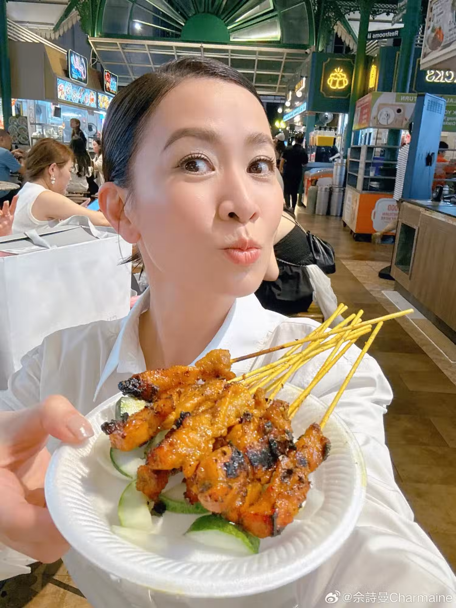 佘詩曼在新加坡大排檔吃沙爹。(圖/取自微博)