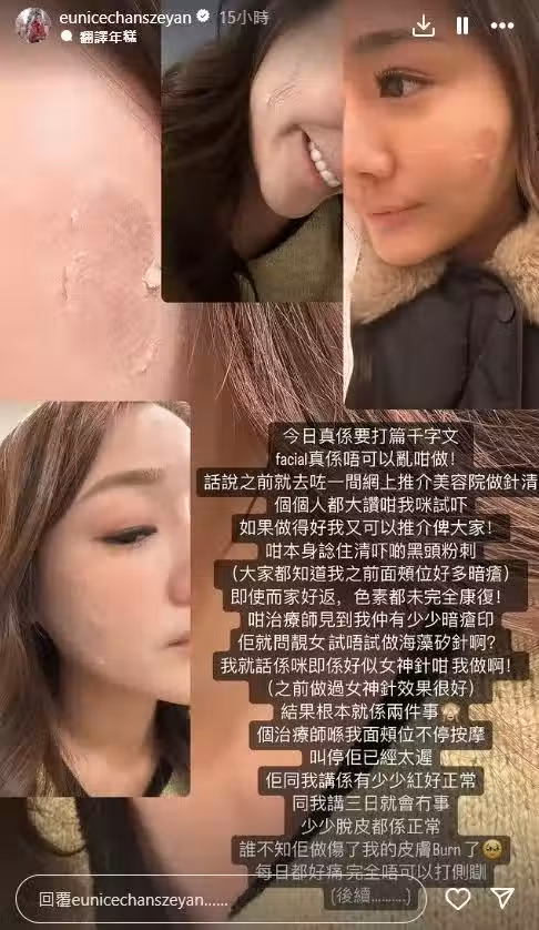 陳詩欣查詢是否有如女神針的做法,而之前試過該方法效果不錯,於是就打算一試,不過出來完全兩回事,她就開始講到過程,看起來令人心驚膽跳,「治療師在我面頰位不停按摩,叫停她已經太遲,誰不知她做傷了我的皮膚燒傷了,每日都好痛完全不可以打側睡覺,她同我講是有點點紅好正常的,同我我講三日就會沒事。」