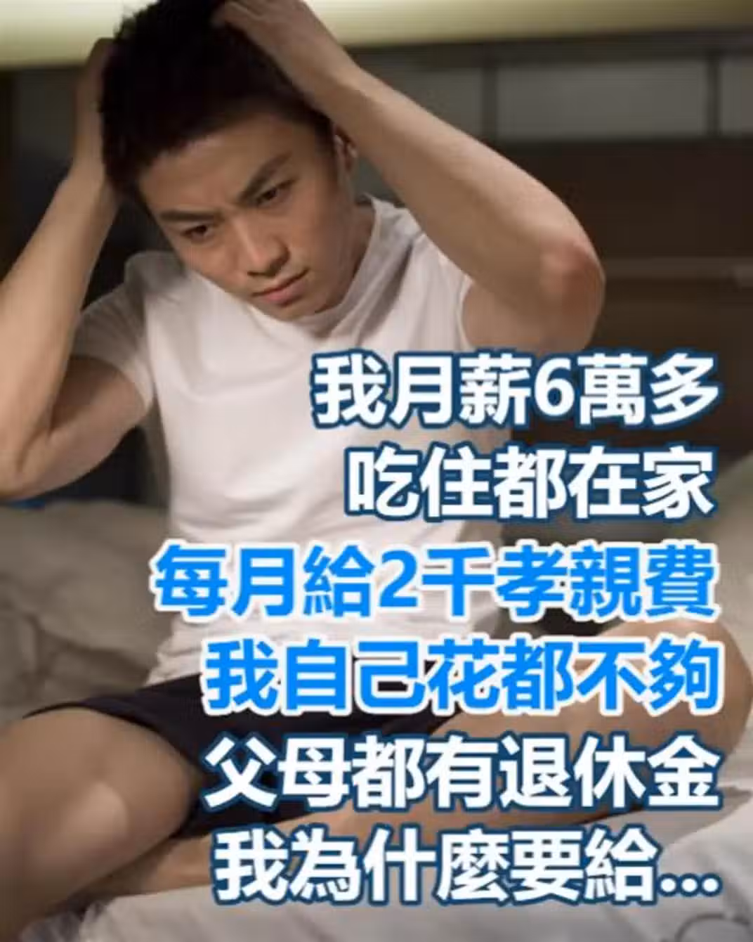 我月薪6萬多,吃住都在家,最近媽媽突然要我「每月給2千孝親費」,我自己花都不夠,為什麼要給?他們都有退休金,而且本來就有撫養義務,反正我覺得不需要~