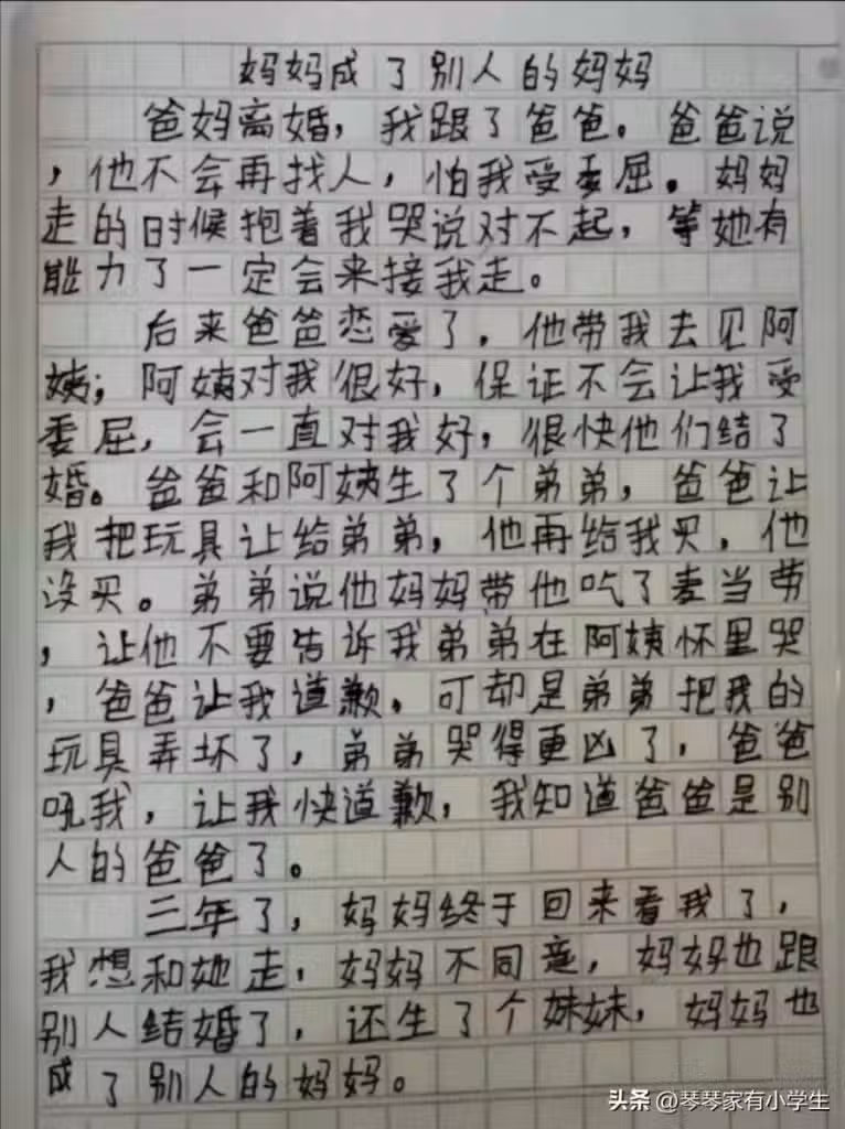 「她變成別人的媽媽…」父母離異,孩子心碎寫作文:媽媽再婚,還生了一個妹妹… # 孩子何其無辜 # 句句戳心