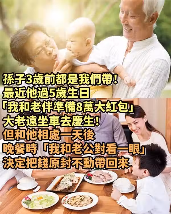 孫子3歲前都是我們帶!最近他過5歲生日「我和老伴準備8萬大紅包」大老遠坐車去慶生!但和他相處一天後,晚餐時「我和老公對看一眼」決定把錢原封不動帶回來😔
