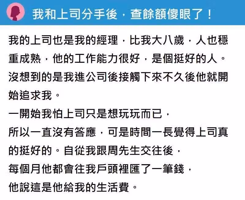 上司叫周先生,跟他交往後他也很照顧我,因為他年紀比我大不少。