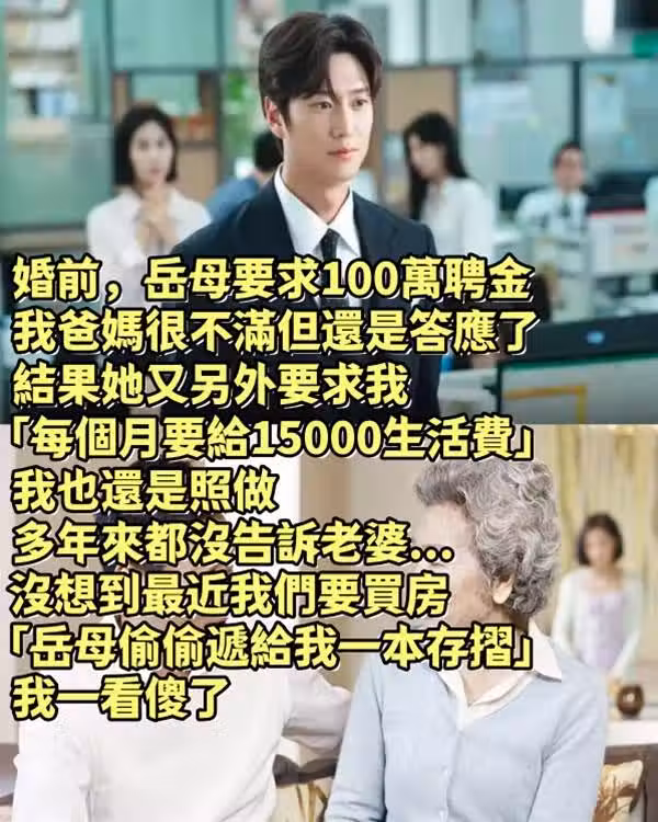 婚前,岳母要求100萬聘金,我爸媽很不滿但還是答應了! 結果她又另外要求我「每個月要給15000生活費」我也還是照做,多年來都沒告訴老婆...沒想到最近我們要買房「岳母偷偷遞給我一本存摺」我一看傻了😲