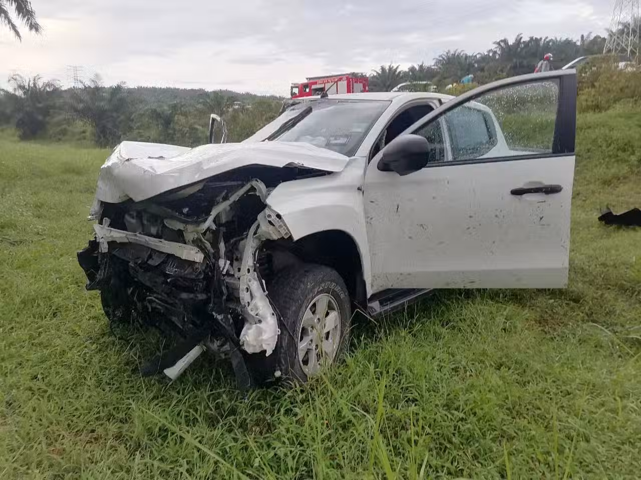 貨卡遭猛烈撞擊後,車頭損毀不堪。(哥打丁宜警方提供)