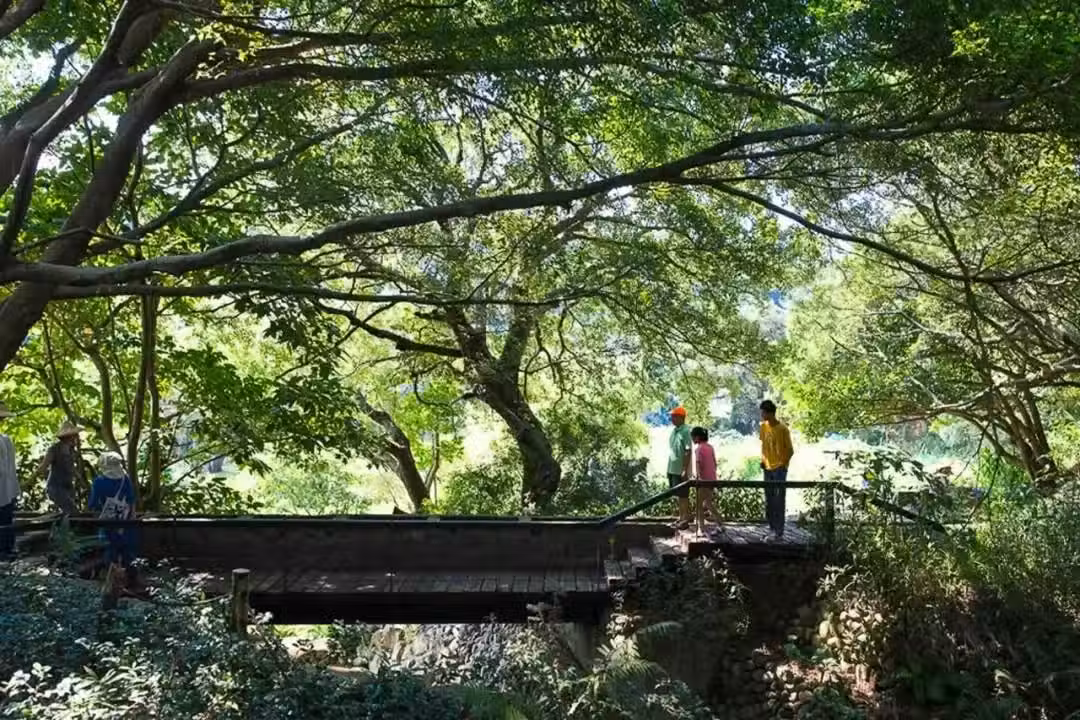 往下坡走,穿過24棟住宅的山門,一條小溪分隔了住宅區和農地,何傳新把將近一半的土地規劃成農園種植作物,過去用來灌溉的古圳渠道、老木橋都被保留下來。