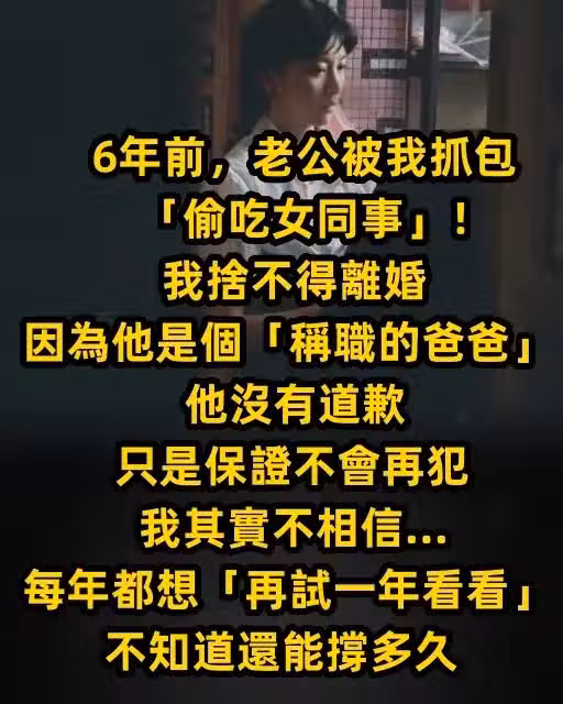 6年前,老公被我抓包「偷吃女同事」!我捨不得離婚,因為他是個「稱職的爸爸」,他沒有道歉,只是保證不會再犯,我其實不相信… 每年都想「再試一年看看」,不知道還能撐多久~