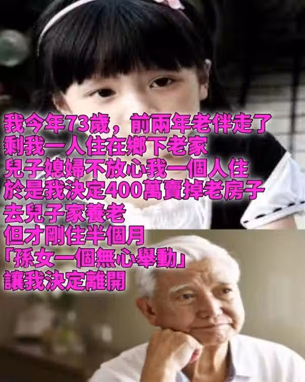 我今年73歲,前兩年老伴走了剩我一人住在鄉下老家!兒子媳婦不放心我一個人住,於是我決定400萬賣掉老房子,去兒子家養老。但才剛住半個月「孫女一個無心舉動」讓我決定離開😭