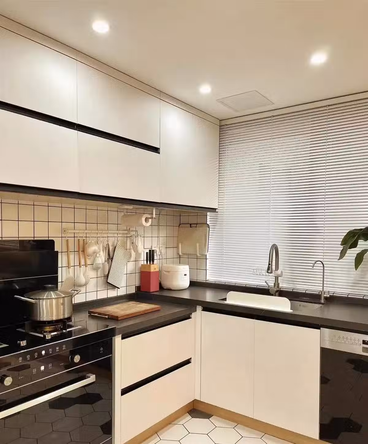 開放式的廚房可以滿足很多需求,整個廚房空間視野非常開闊,採光也好,家人在客廳玩耍的時候扭頭就能進行交流,同時對於愛亂放的毛病也能改善,超長U型台面根本無法忍受亂糟糟。