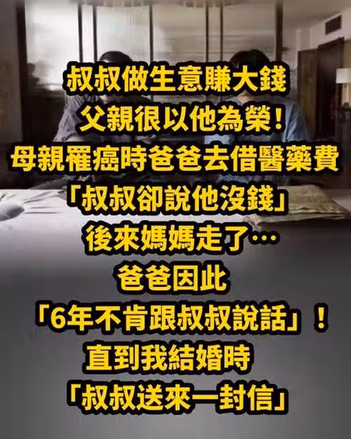 叔叔做生意賺大錢父親很以他為榮!母親罹癌時爸爸去借醫藥費「叔叔卻說他沒錢」後來媽媽走了… 爸爸因此「6年不肯跟叔叔說話」!直到我結婚時「叔叔送來一封信…」