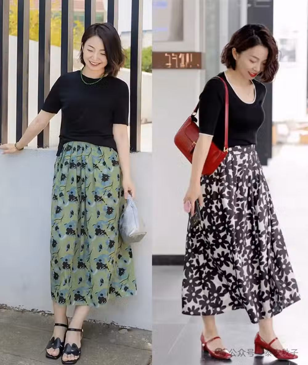 為了能彰顯出這個年齡段的成熟美,愛美的女人會利用輕薄、修身的印花半身裙,構造出簡單、減齡又顯氣質的日常穿搭。
