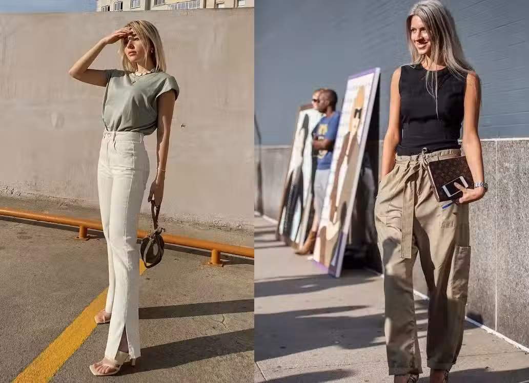 卡其色工裝闊腿褲搭配黑心背心,穿出了幹練利落又颯爽獨立的魅力,同時也能營造出一種女性霸氣的氣勢