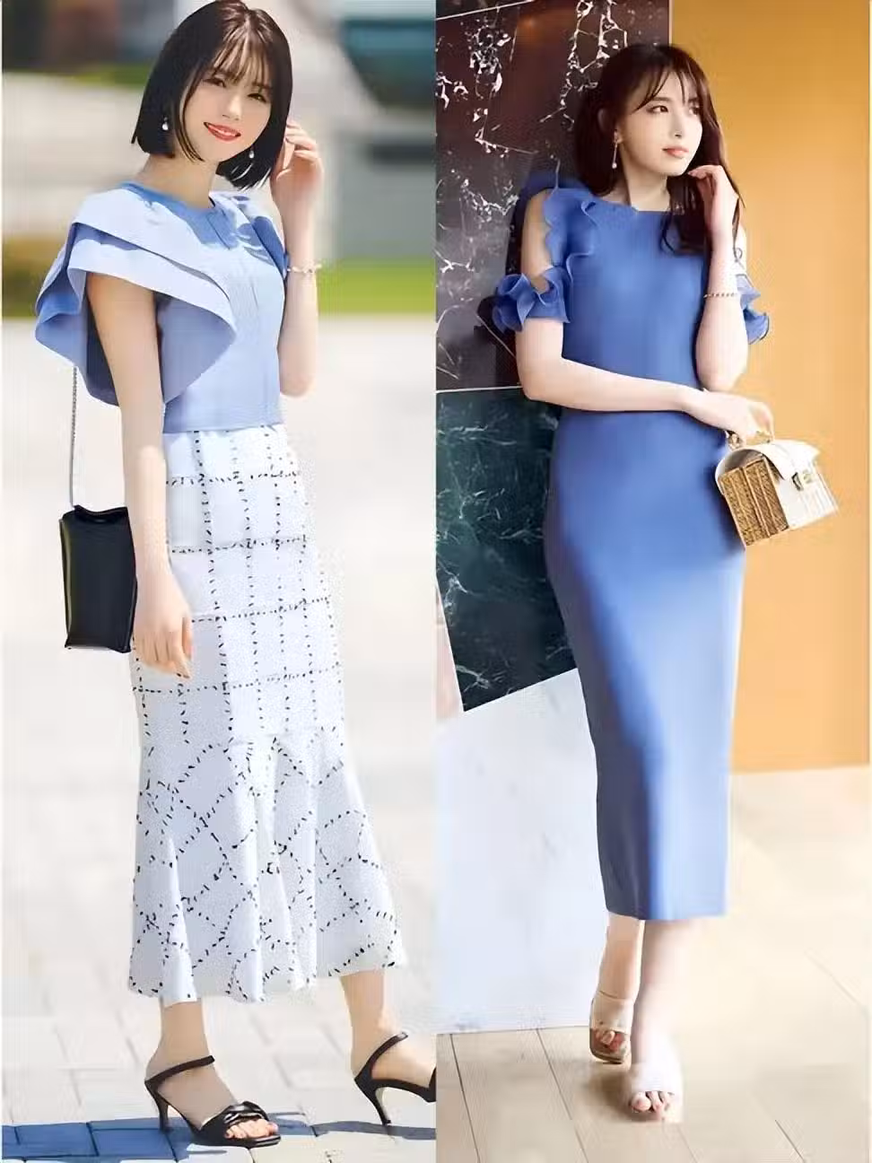 我們可以學習到很多的搭配小技巧,上衣可以選擇短款,這樣的短上衣配上高腰的半身裙就可以很簡單的去改善我們的身材比例,從而突出你的身材優勢,展現你的大長腿。