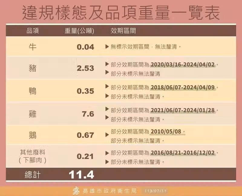 從現場存放肉品中,更查獲過期豬肉2.53公噸、雞肉7.6公噸、鴨肉0.35公噸、牛肉0.04公噸、鵝肉0.67公噸,以及0.21公噸的廢料,綜合重量非常驚人。