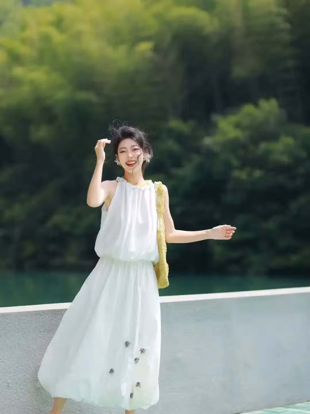 穿裙子拍照,可以讓自己擺拍一個背對鏡頭的姿勢,然後讓攝影師仰拍,你做一個稍微轉頭看鏡頭微笑的動作,配合兩手舉起來,這樣能捕捉到瞬間的動態美,裙裝美照立馬拍出來,又高好看又有氣質。